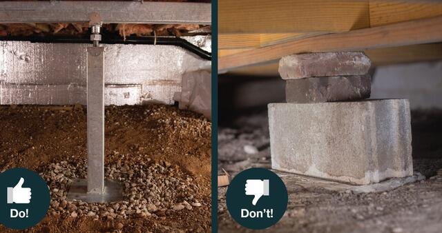 Sagging floors stabilized under the crawlspace using Defender Concrete's Smart Jack system.